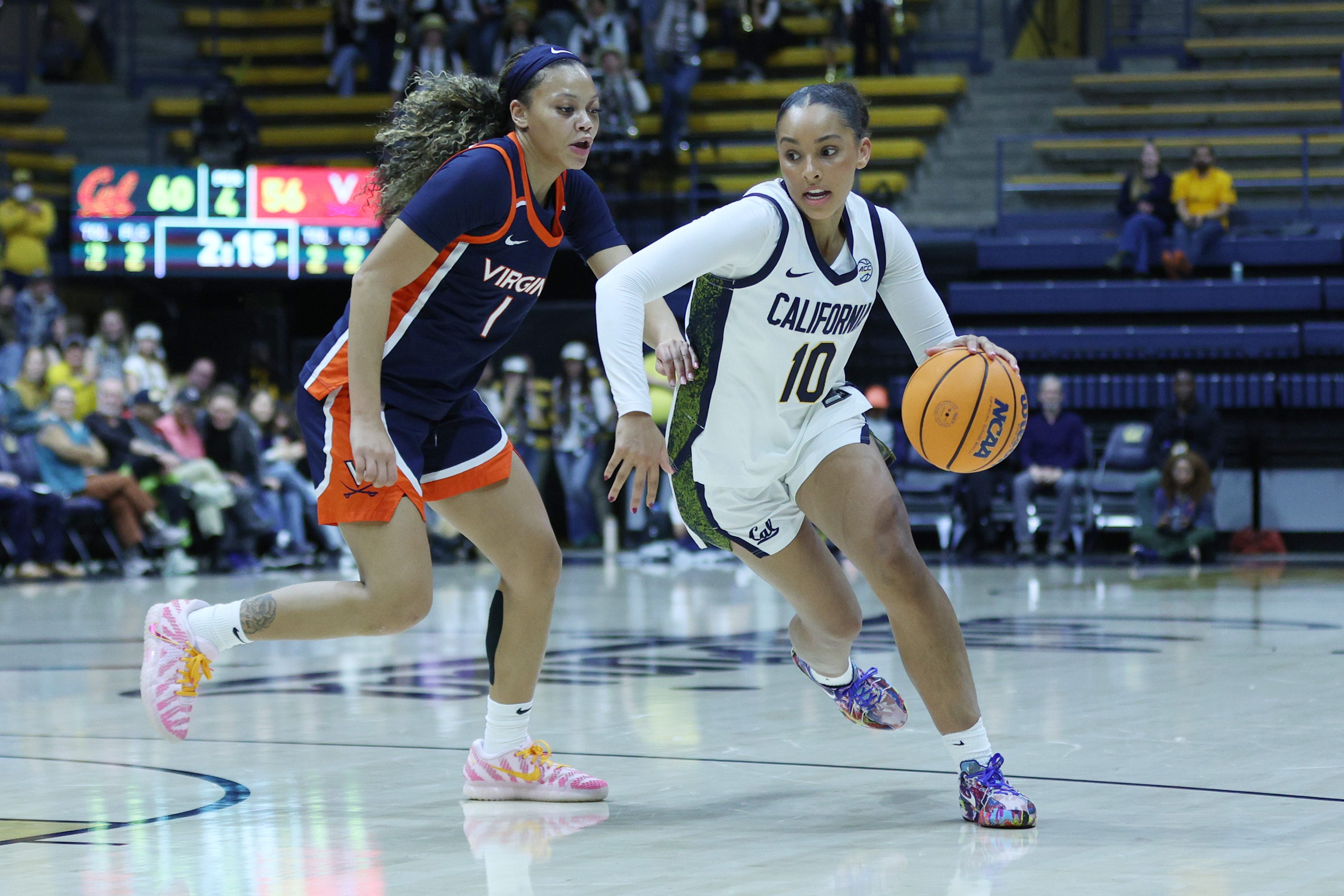In Sunday’s win over Pitt, Cal’s defense let up in the fourth quarter as Cal led comfortably and were never seriously threatened. Coach Charmin Smith obviously emphasized defense coming into tonight’s game. Cals guards fought extra hard to work through screens and stay connected to Kymora Johnson. Johnson was held to 4 points on four shot attempts. The Cavaliers shot 36% for the half, and were only 1-of-6 from long range.