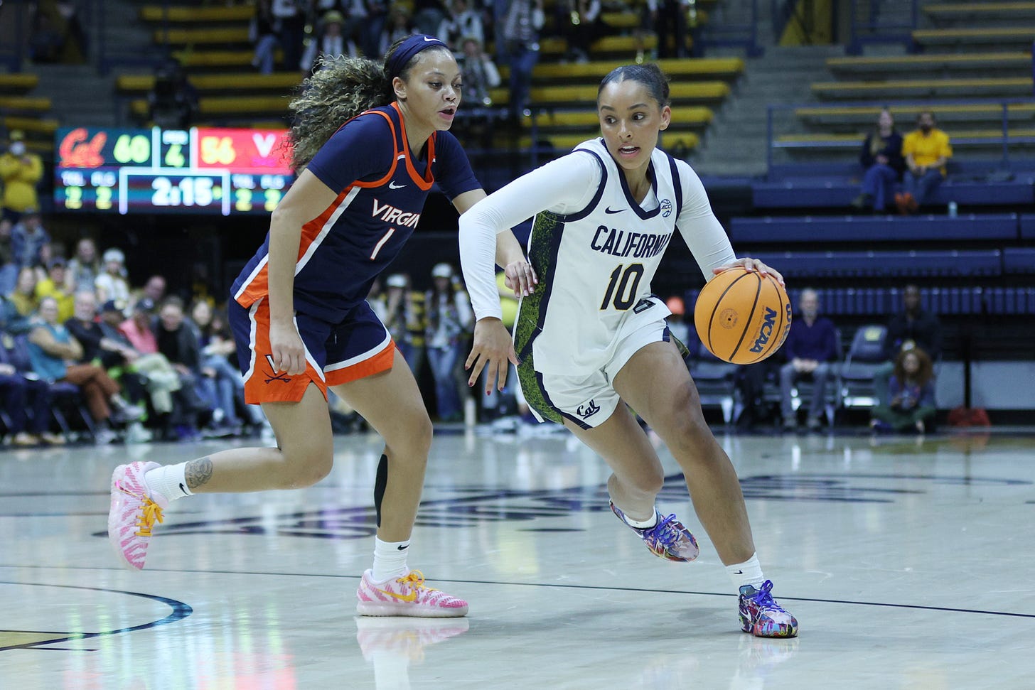 Virginia opened the third quarter scoring six straight points, forcing Coach Smith to call a timeout to regroup Cal’s defense. It was a quarter of streaks, as Virginia started the period on an 8-0 scoring streak. Cal responded with a 7-1 scoring run, followed by Virginia ending the period with seven straight points. The Bears connected on only three shots on thirteen attempts as Cal’s lead was reduced to 53-45 entering the final period.
