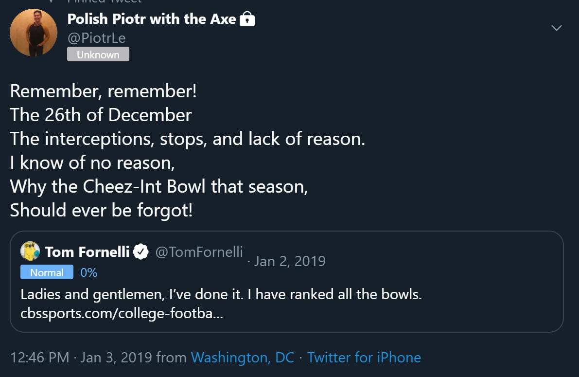Tom Fornelli considers the 2018 Cheeze-It Bowl the greatest college bowl of 2019, not due to the quality of football, but for the social experience watching this game was at the stadium or online. I happen to agree, it was a memorable catastrophe that was the Cheeze-It dust crusted bow on the 2018 season.
